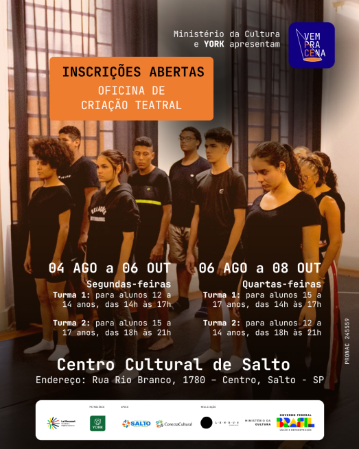A York, por meio da Lei Federal de Incentivo à Cultura, patrocinou o projeto VEM PRA CENA — um projeto de oficinas de teatro GRATUITAS para jovens de 12 a 17 anos, na cidade de Salto/SP.